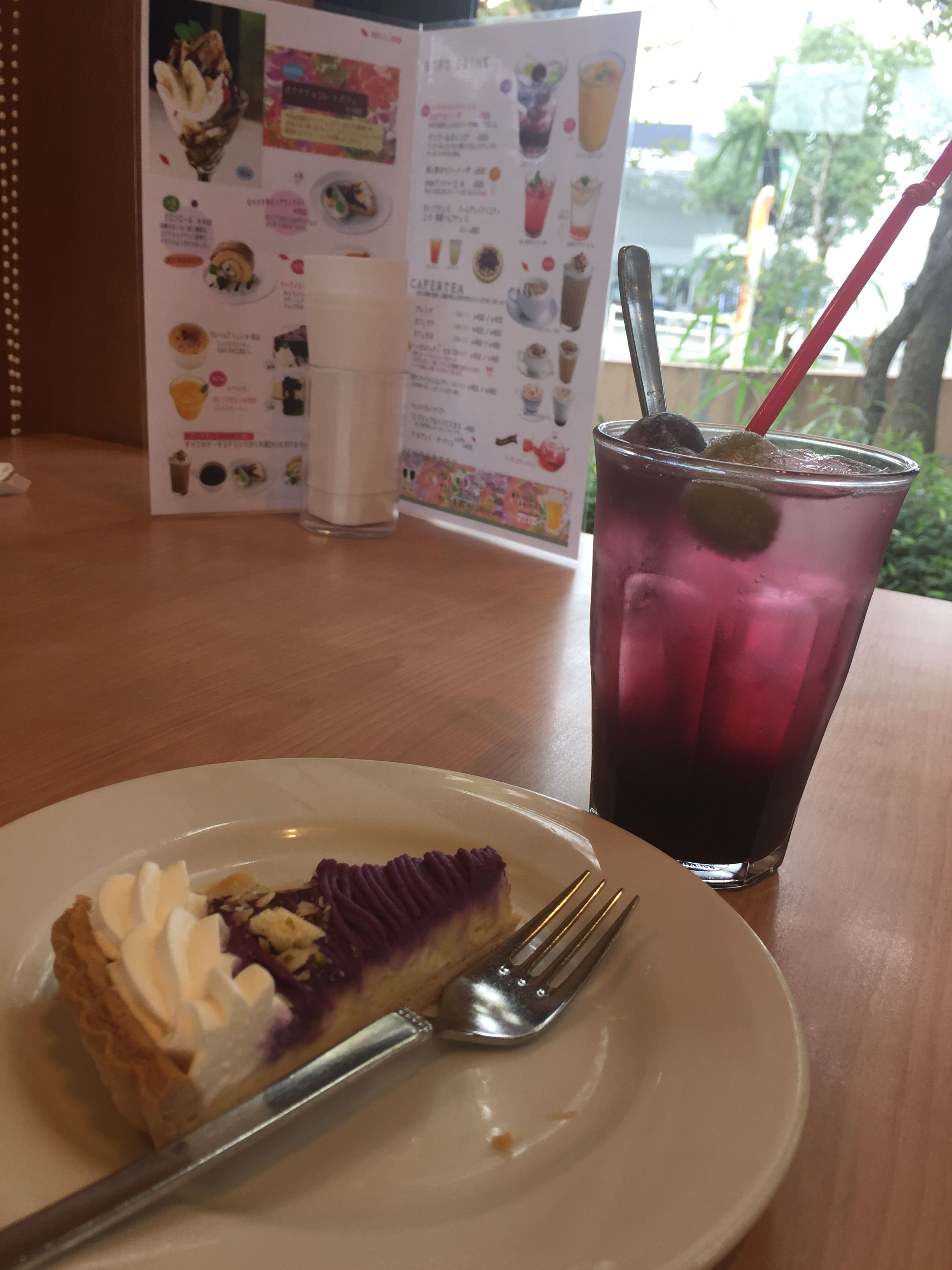 ポリフェノールを意識して、ぶどうがまるごと入ったぶどうソーダと紫いものタルトをチョイス。