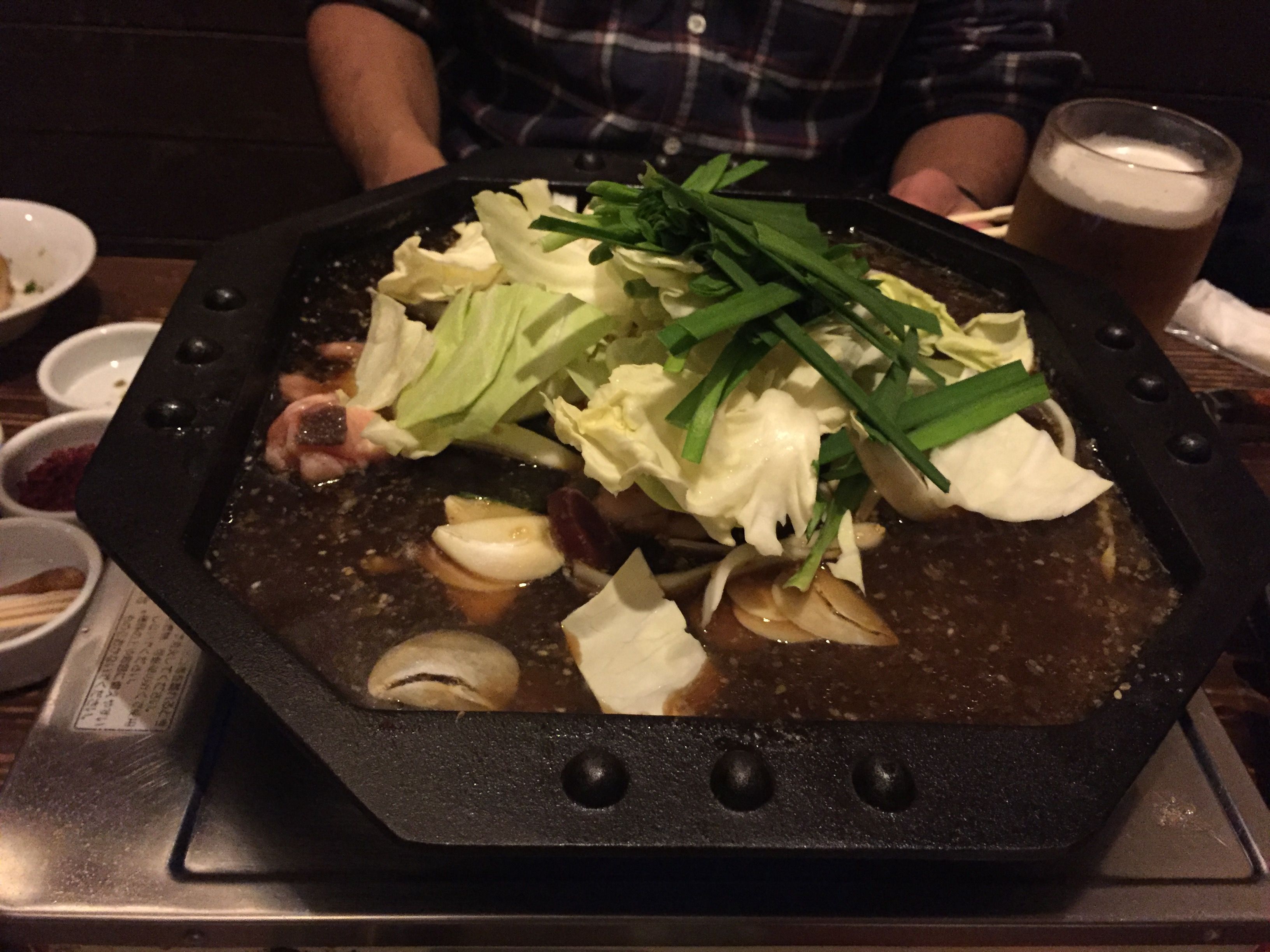 もちろん食材にもこだわった平たい鉄鍋のもつ鍋は、よくある味噌か醤油かではなく秘伝のタレで頂きます。
