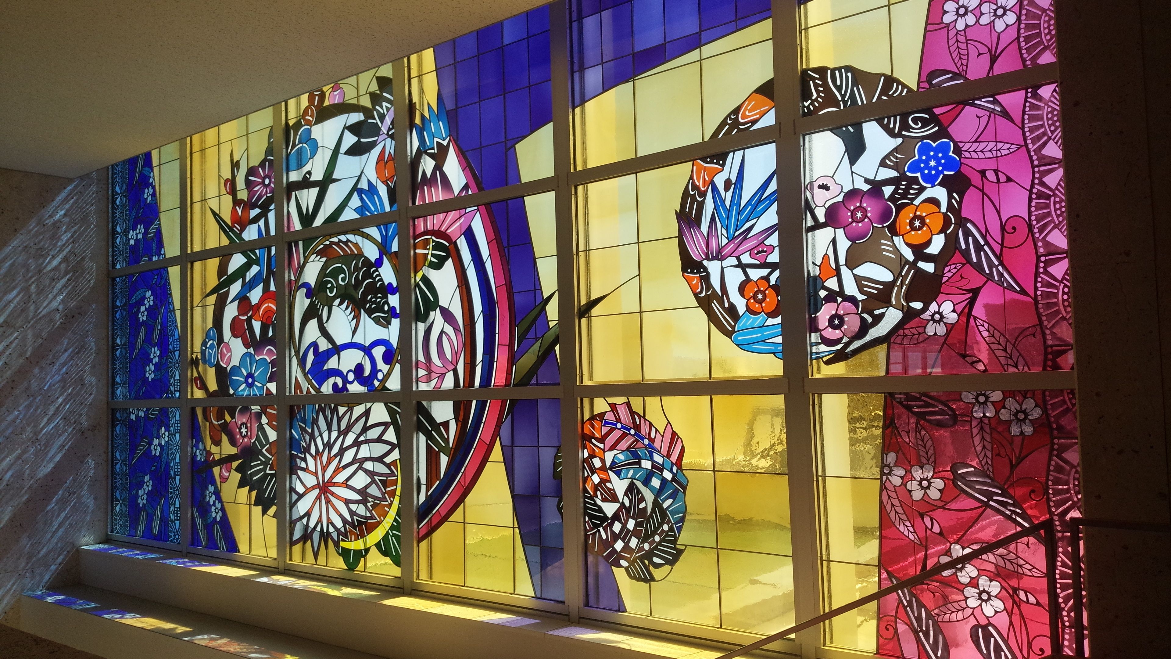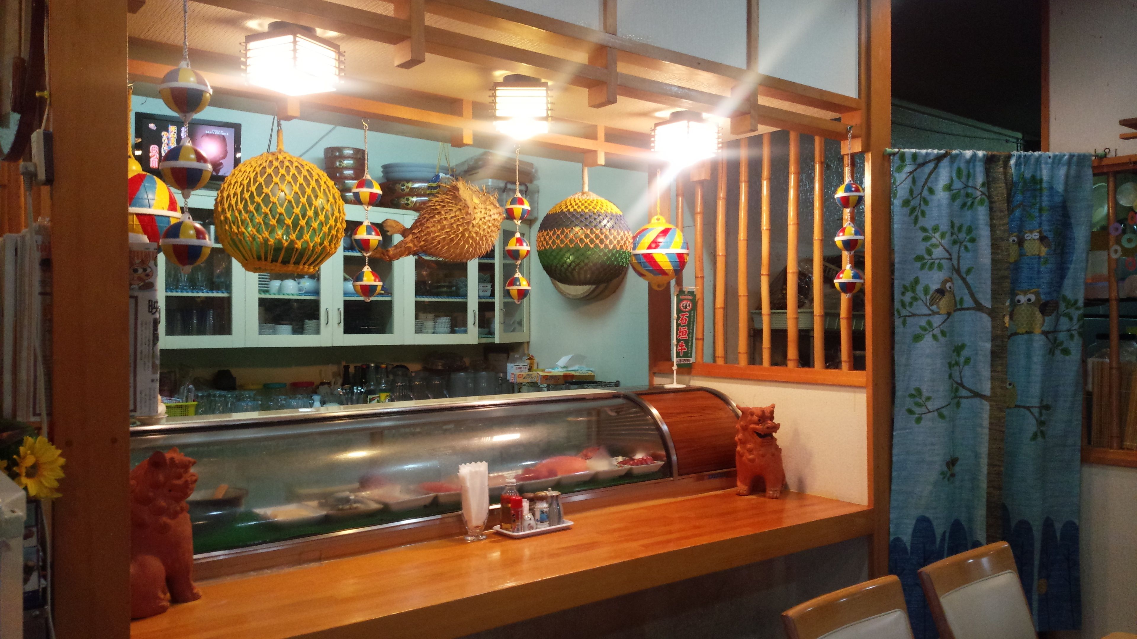 南ぬ島石垣空港の鮮やかな紅型のステンドグラスに迎えられた後、離島フェリーターミナル近くにある郷土料理の「山海亭」へ。