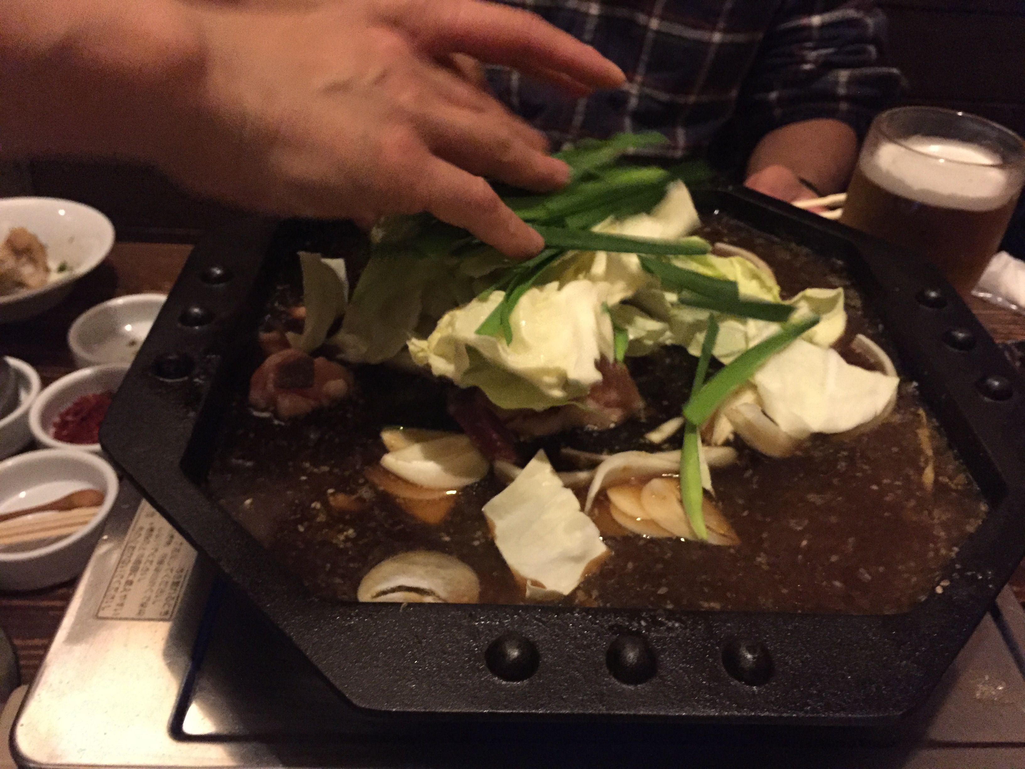 玉ねぎ、もつ、キャベツ、ニラが目の前で煮込まれます。