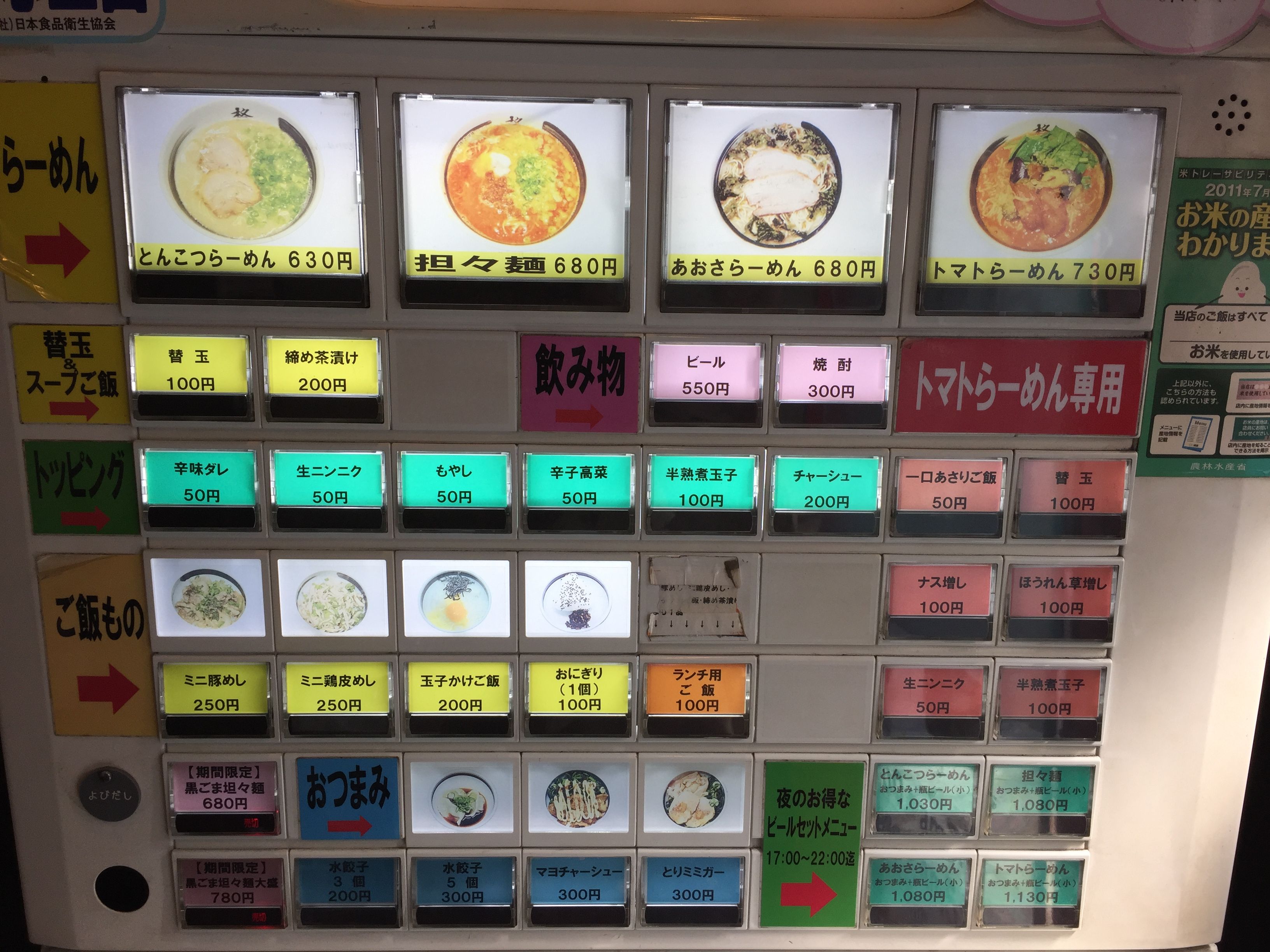 ラーメンの種類は「とんこつ」「担担麺」「あおさ」「トマト」の4種類です。