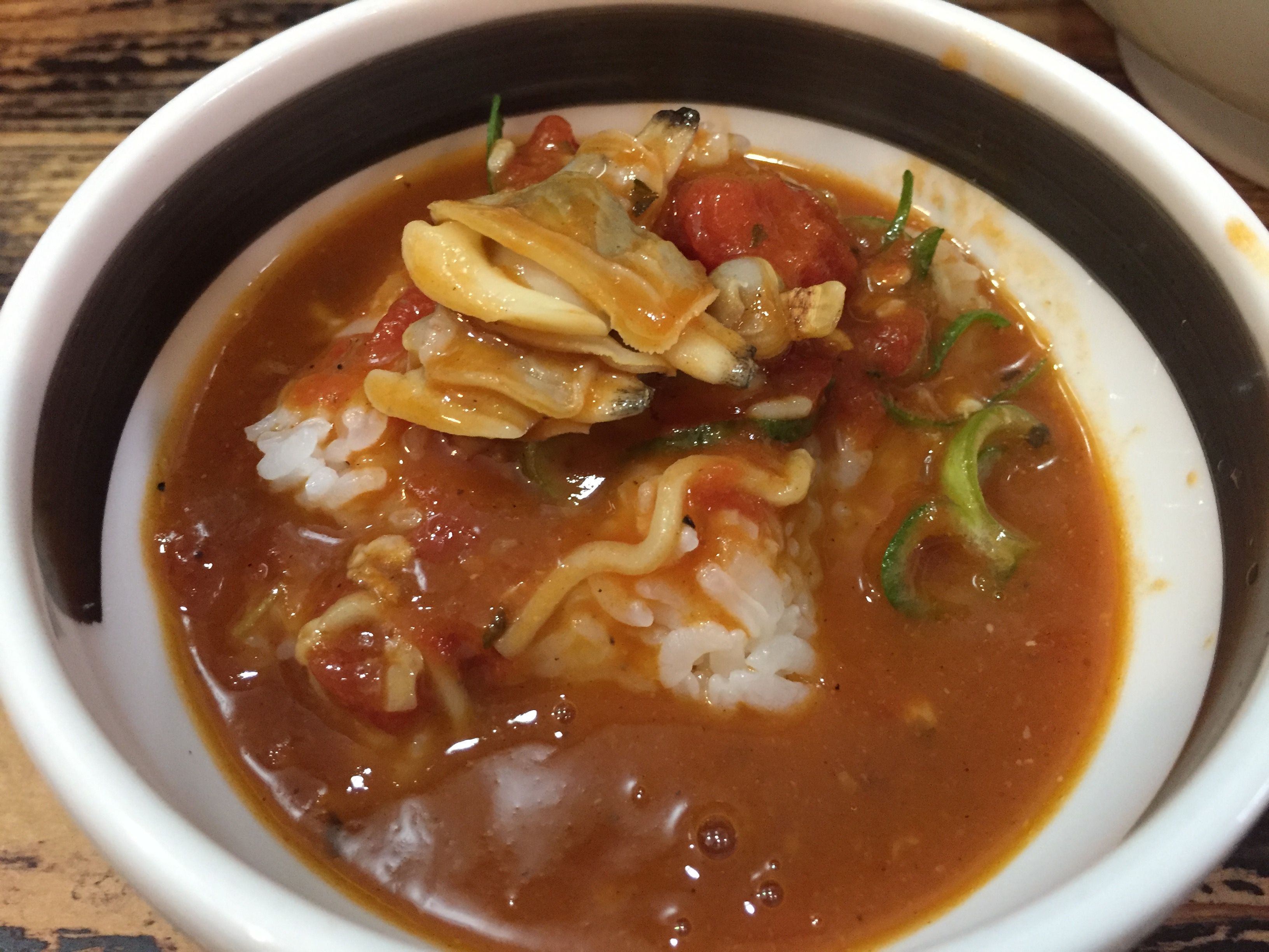 ランチ時のみ「一口あさりごはん」か「おにぎり」がサービスされ、私は残ったスープをあさりごはんにたっぷりかけてシメます。
