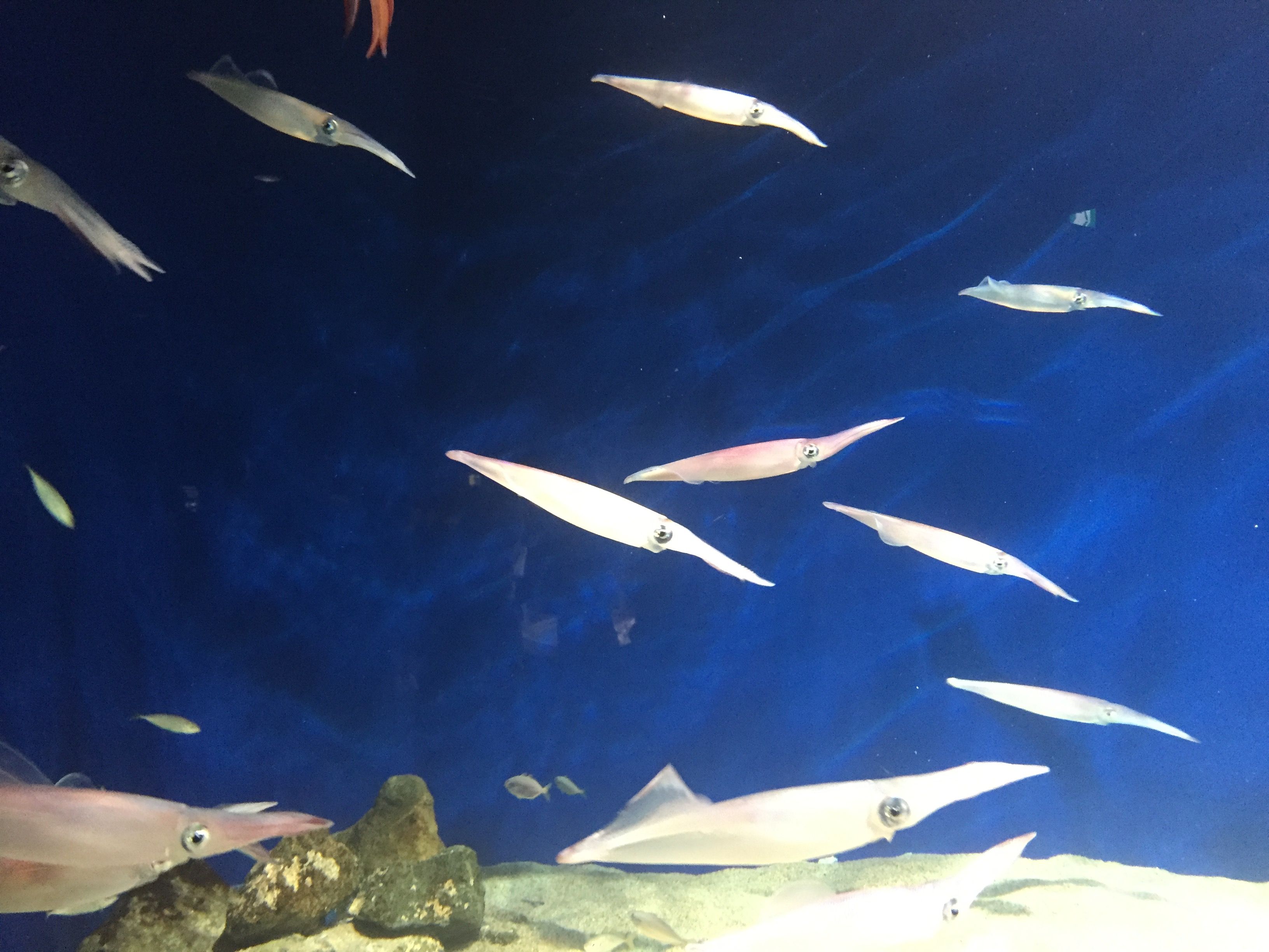 横にすいすい泳いでいくイカもたくさん。