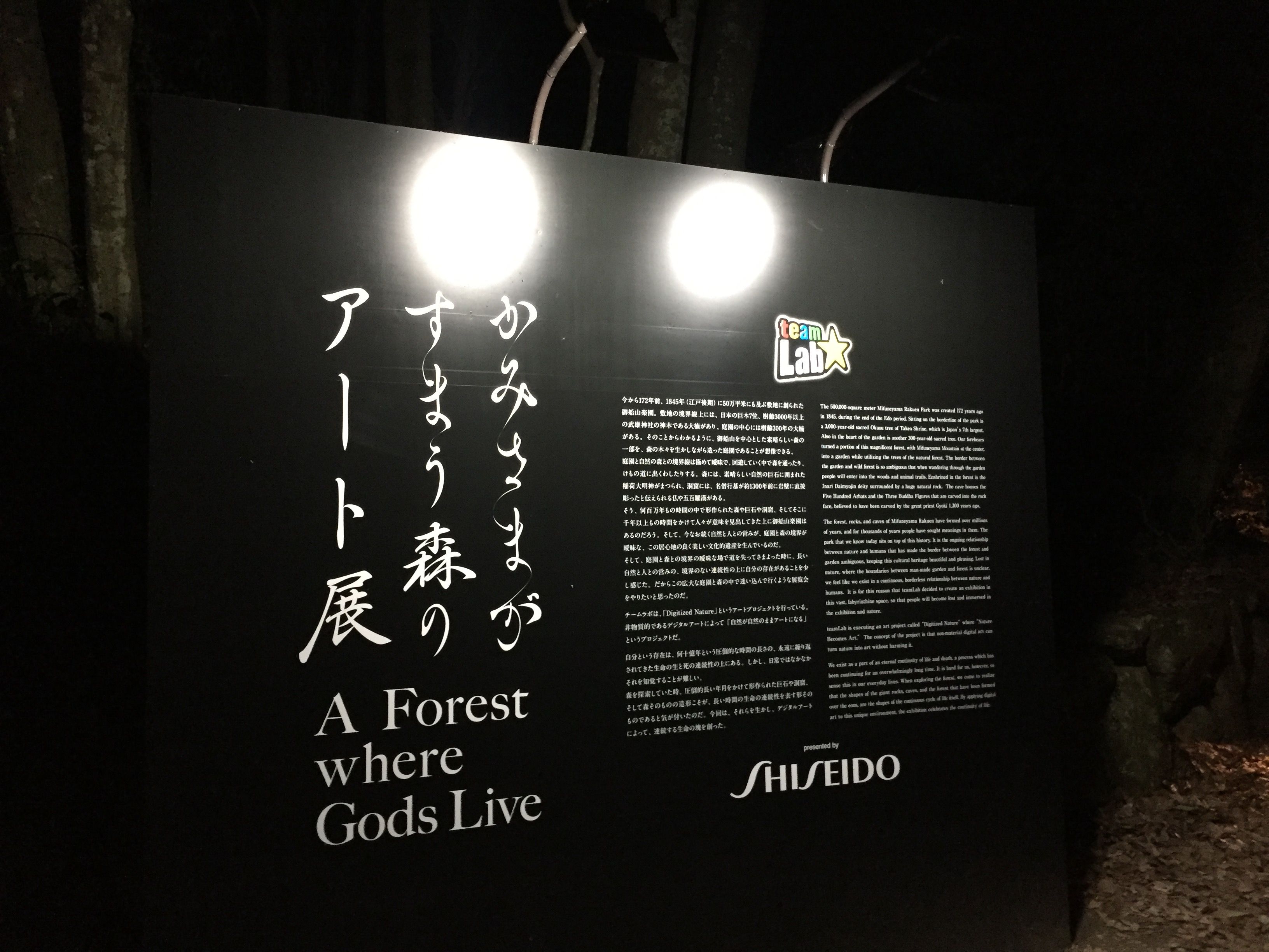 都心でも様々なアート展を手がけているチームラボですが、自然のなかに溶け込んだプロジェクションマッピングは夜の森というシチュエーションのせいもあり、更に神秘的に感じました。