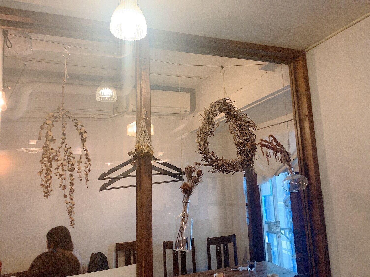 赤を基調にしたおしゃれな外観のお店で、店内はドライフラワーなどが飾られたおしゃれで落ち着いた空間です。
