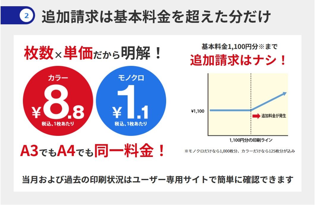 料金はモノクロ1枚あたり1.1円(税込)、カラー1枚あたり8.8円(税込)