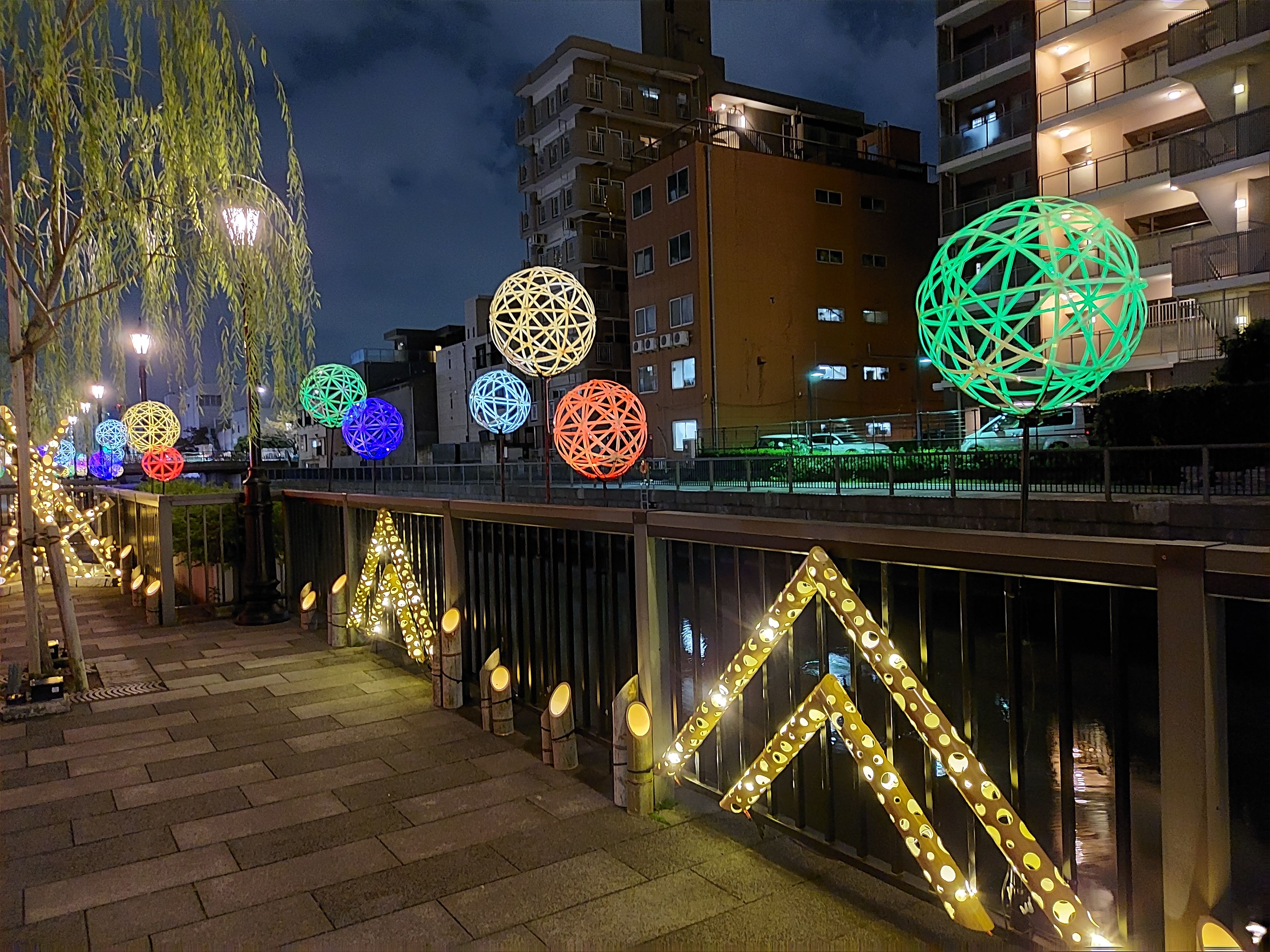 この前昼間にお散歩していたら川沿いにも装飾されていたので、夜に再び出直してみました