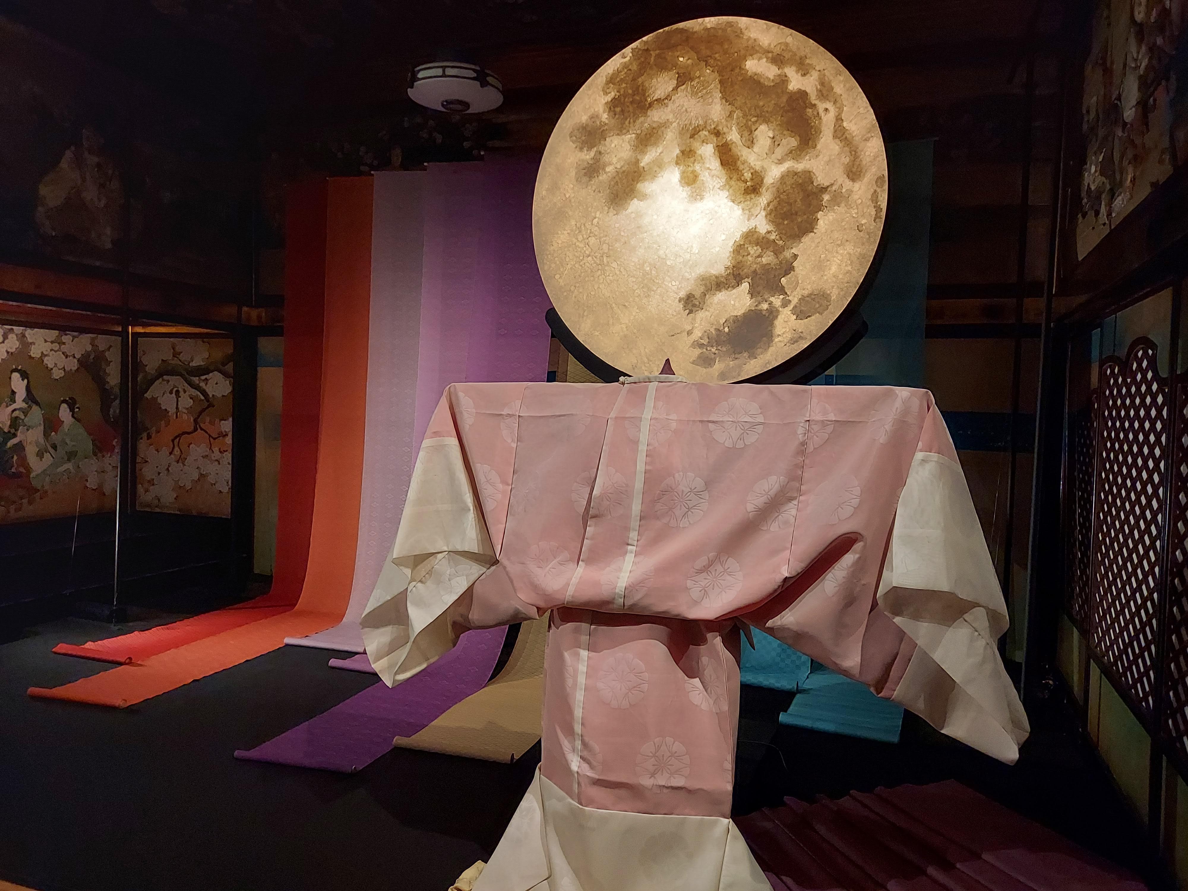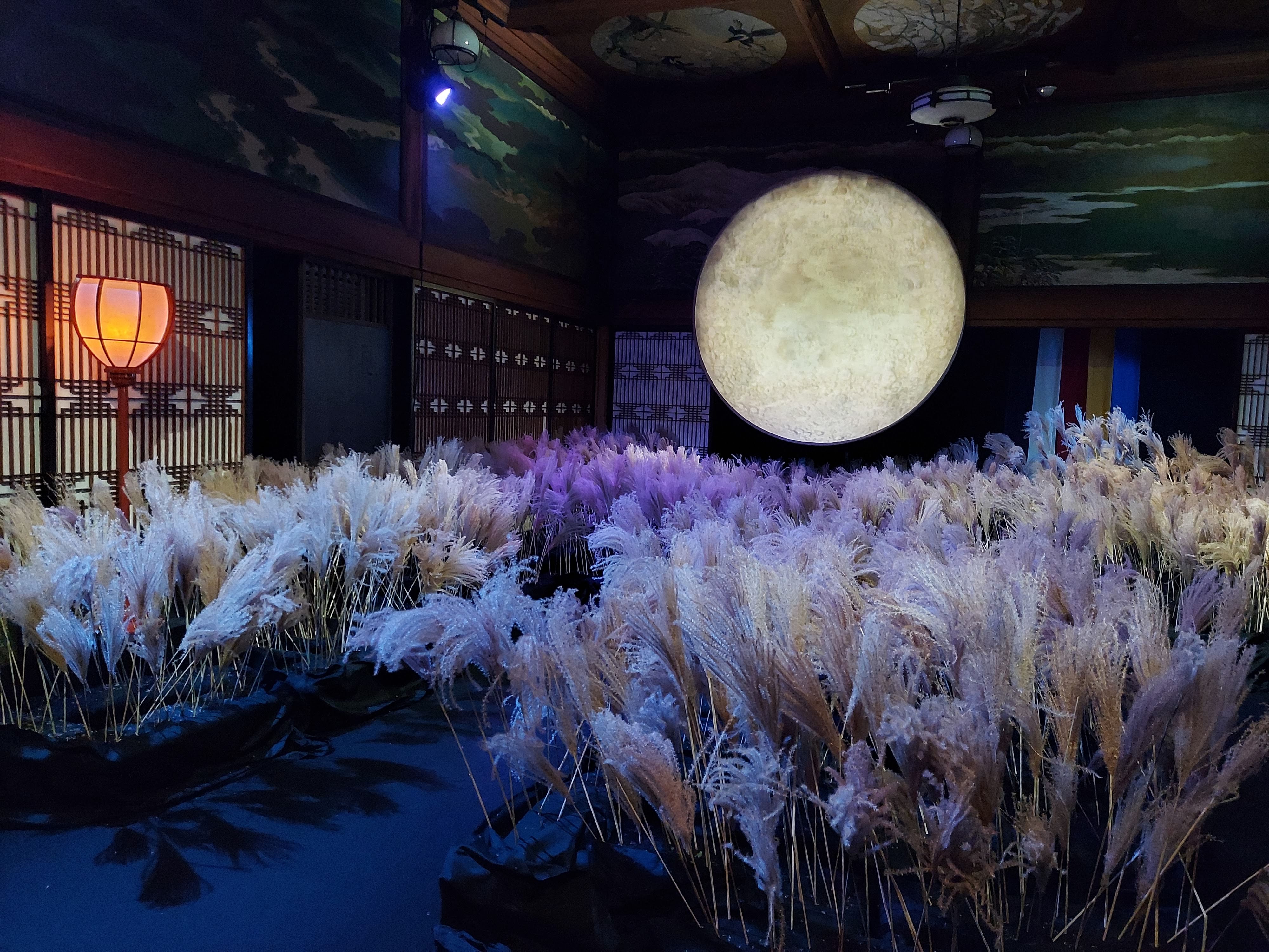 風が吹く室内で、プロジェクションマッピングにより月も様相を変えます。
