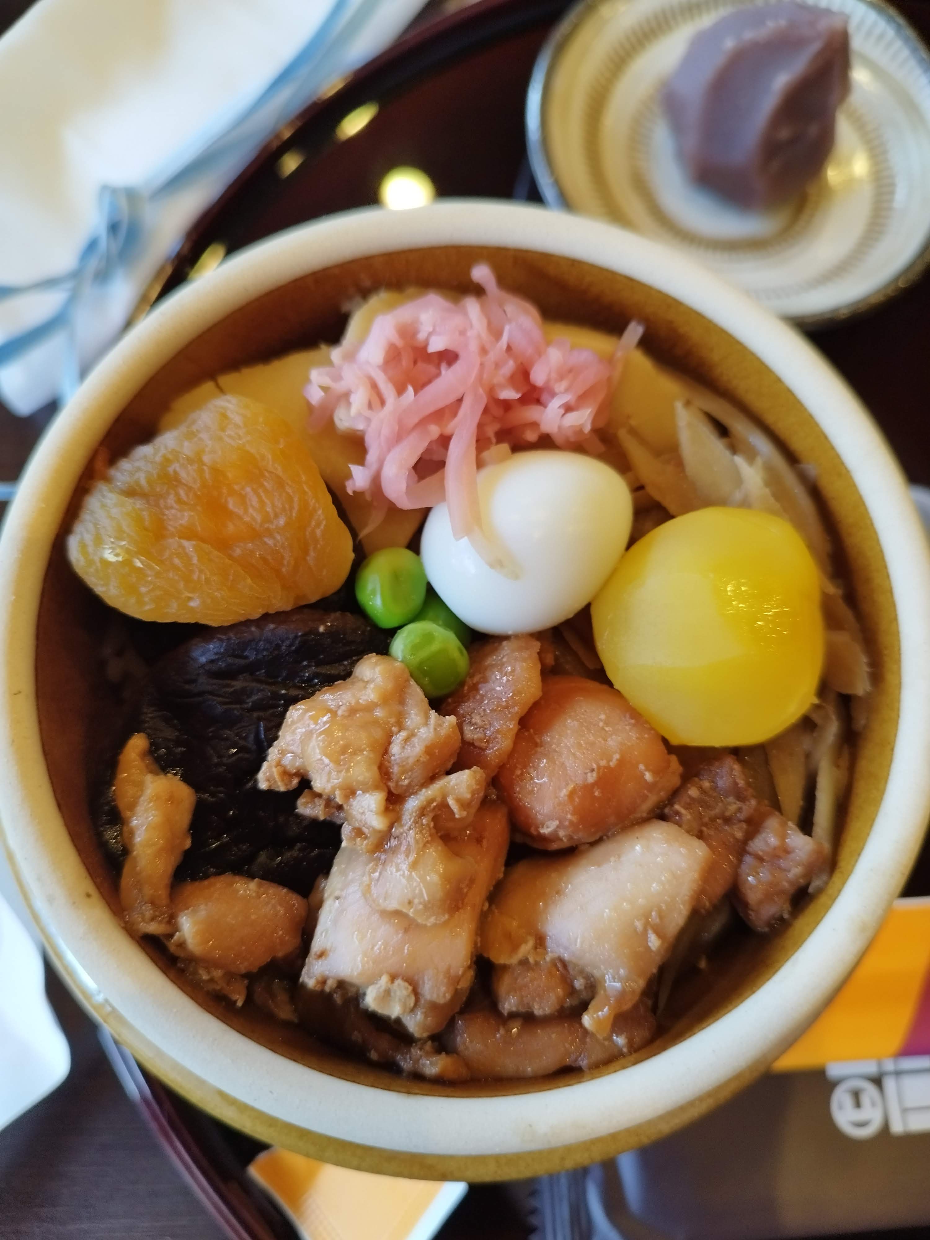 昆布の出汁とともに炊き上げたコシヒカリの茶めしの上に、鶏肉、牛蒡、椎茸、筍、鶉の卵、栗、杏子、グリンピース、紅生姜といった9種類の色とりどりの具材がのっています。