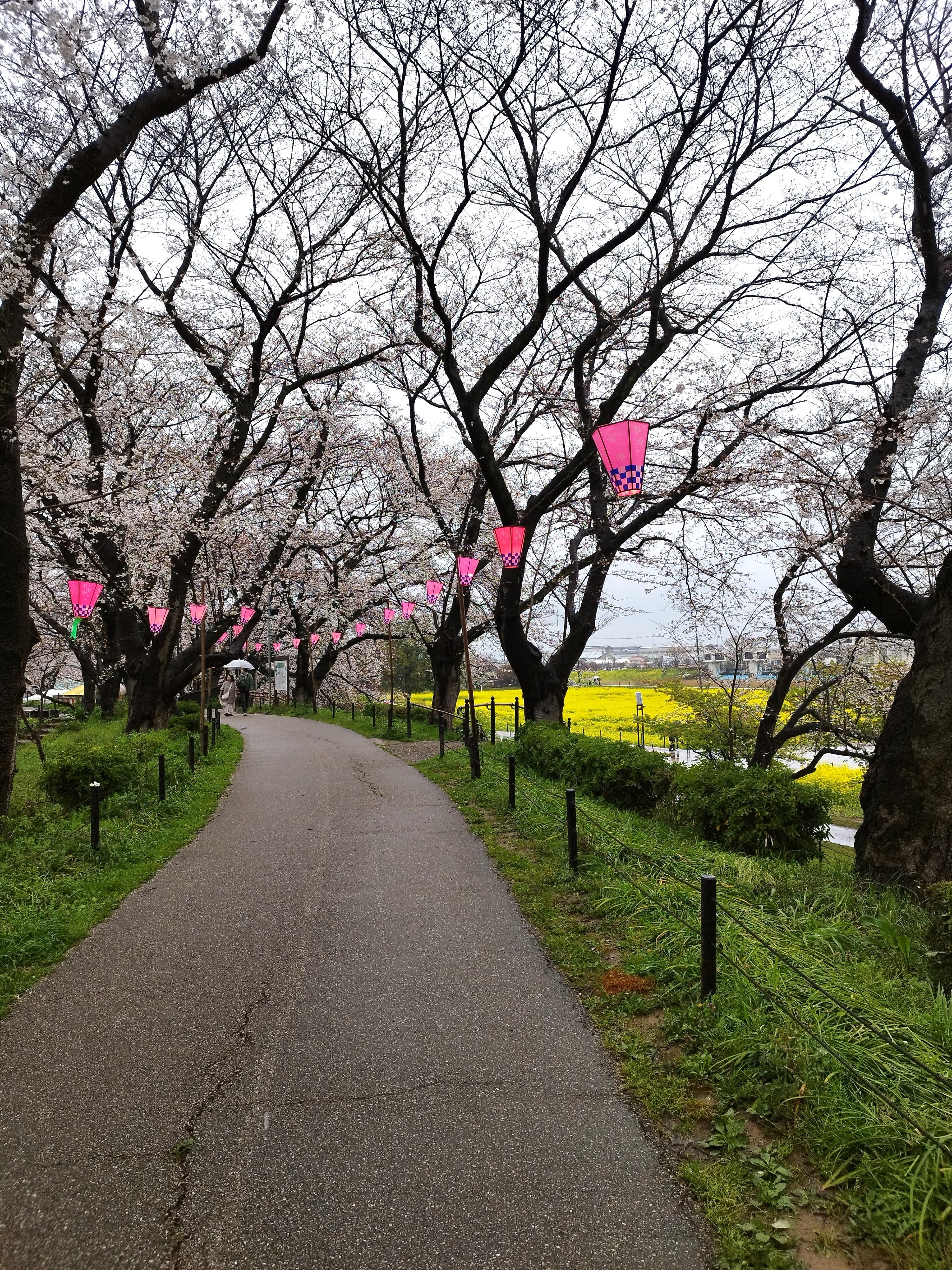 桜並木の歩道には提灯も飾られていますね