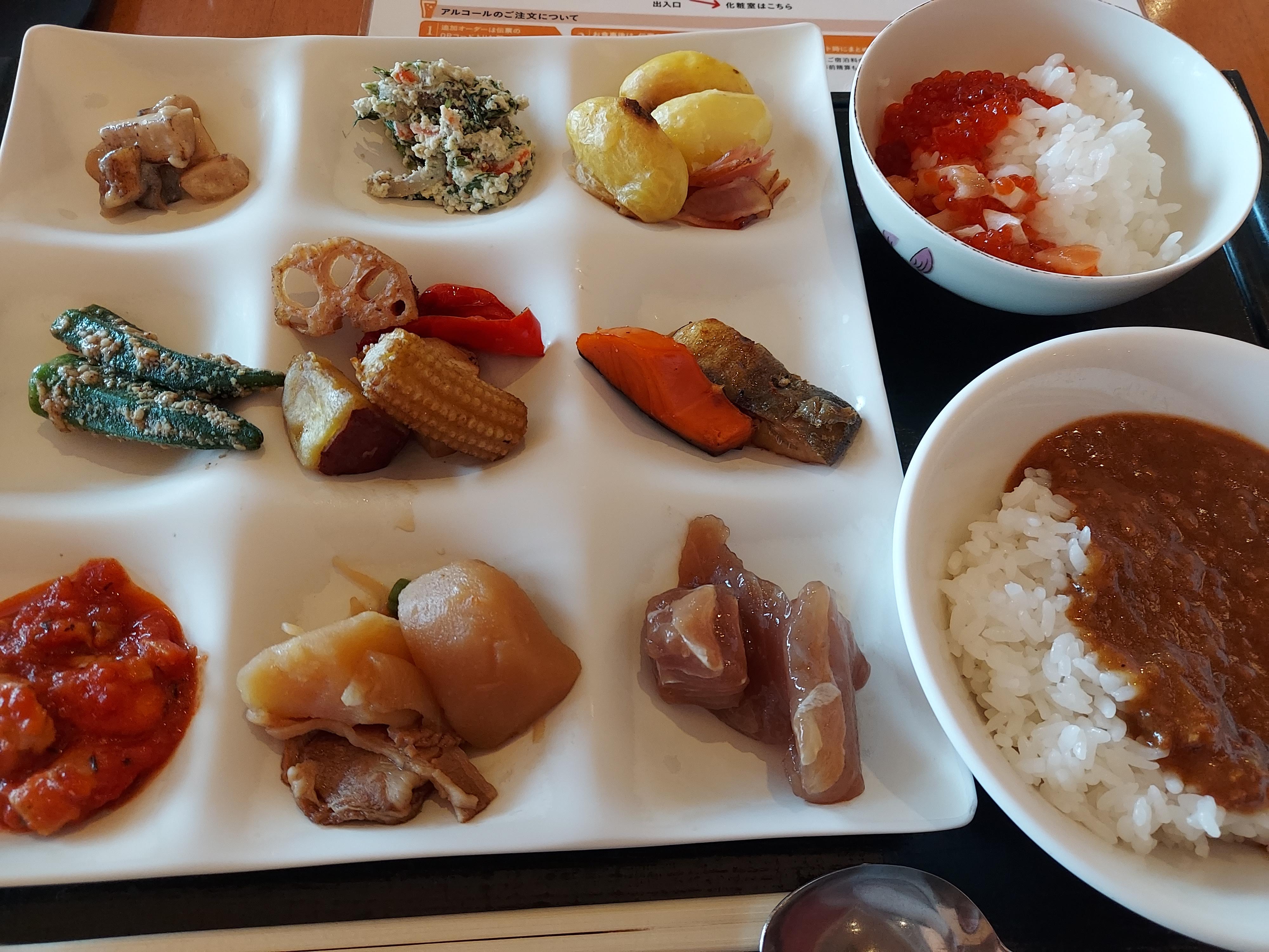 朝から海鮮丼、カレー、ジャガイモもいろんな調理のものをしっかり頂きました