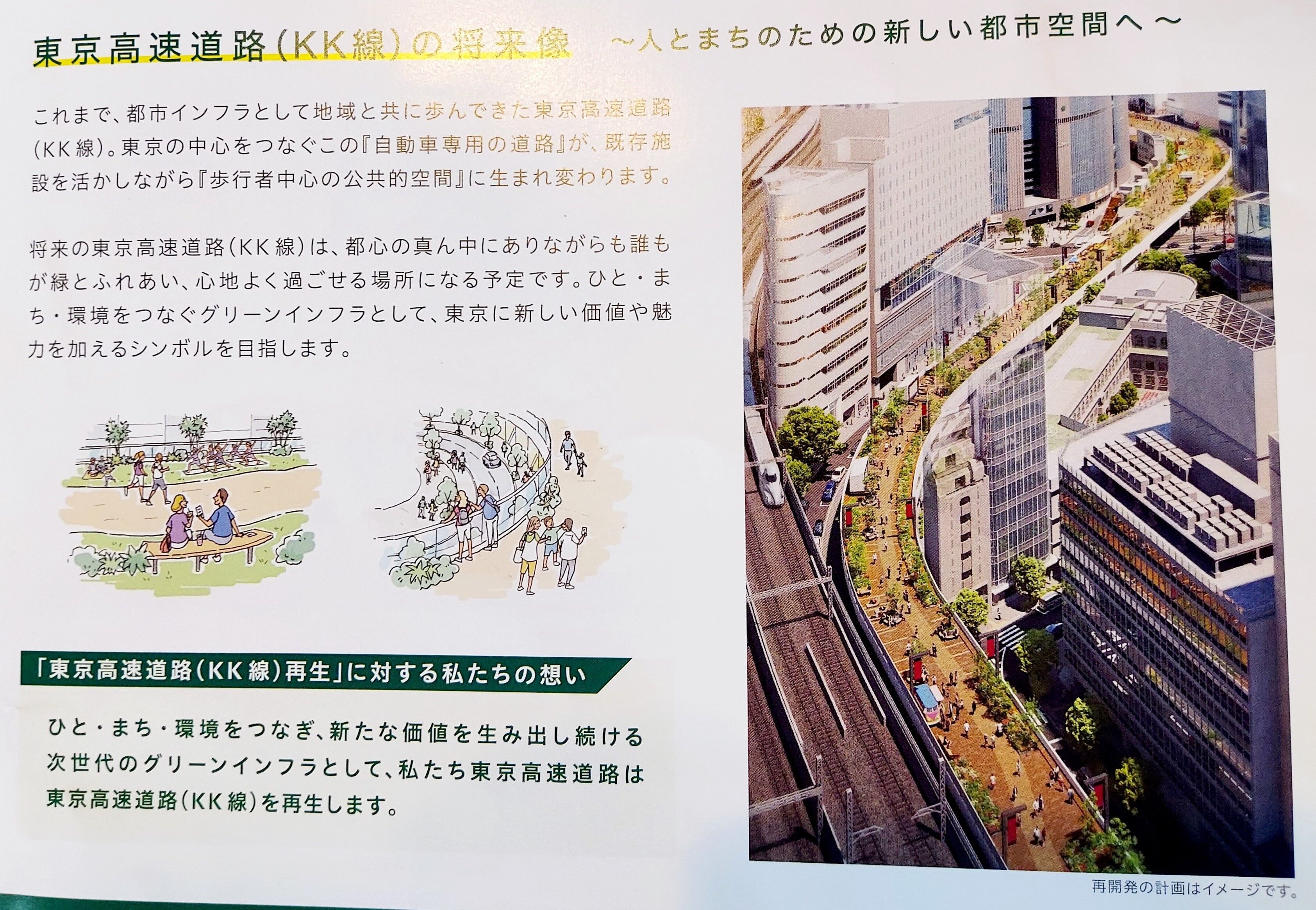 今後は、東京高速道路(KK線)再生方針にもとづき、歩行者中心の公共的空間へと再生するプロジェクトを推進していくそうです。