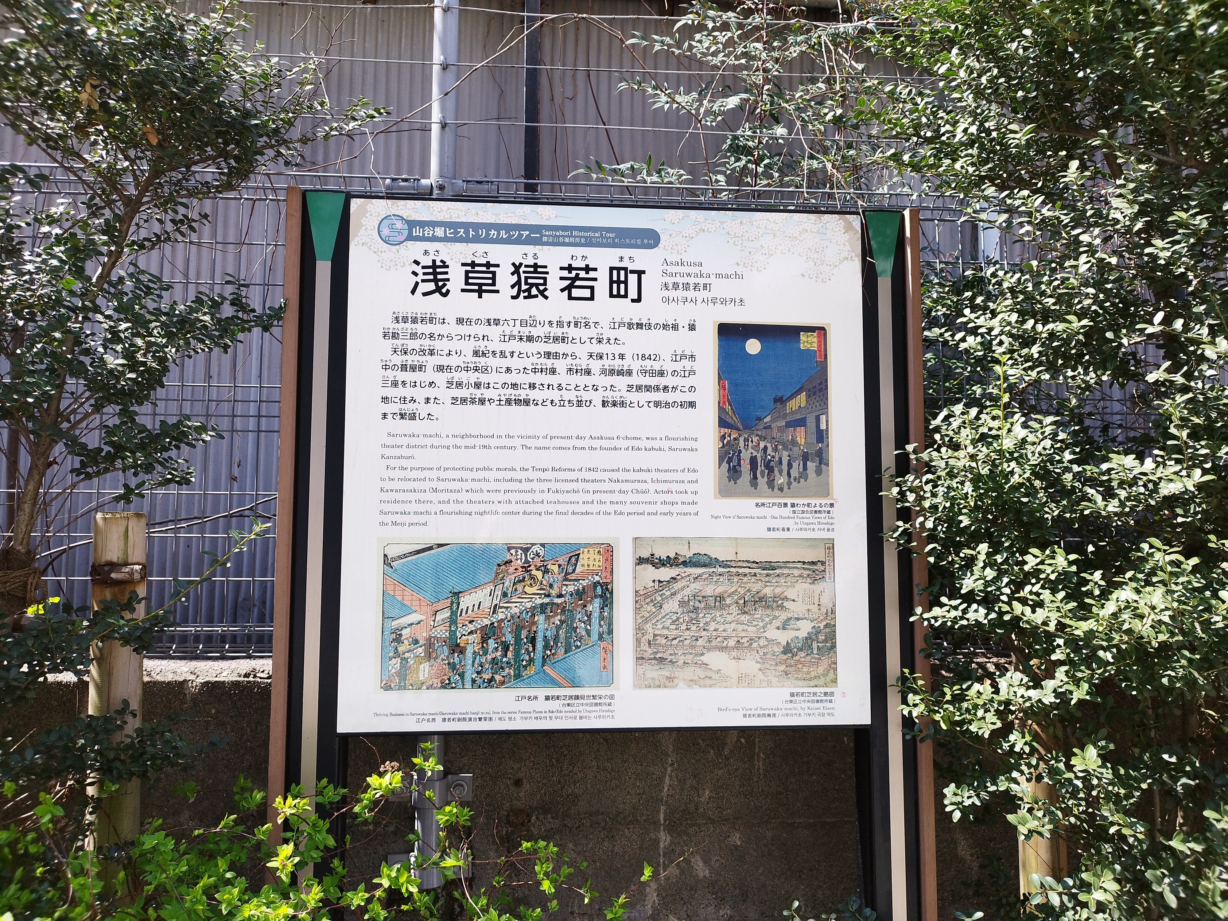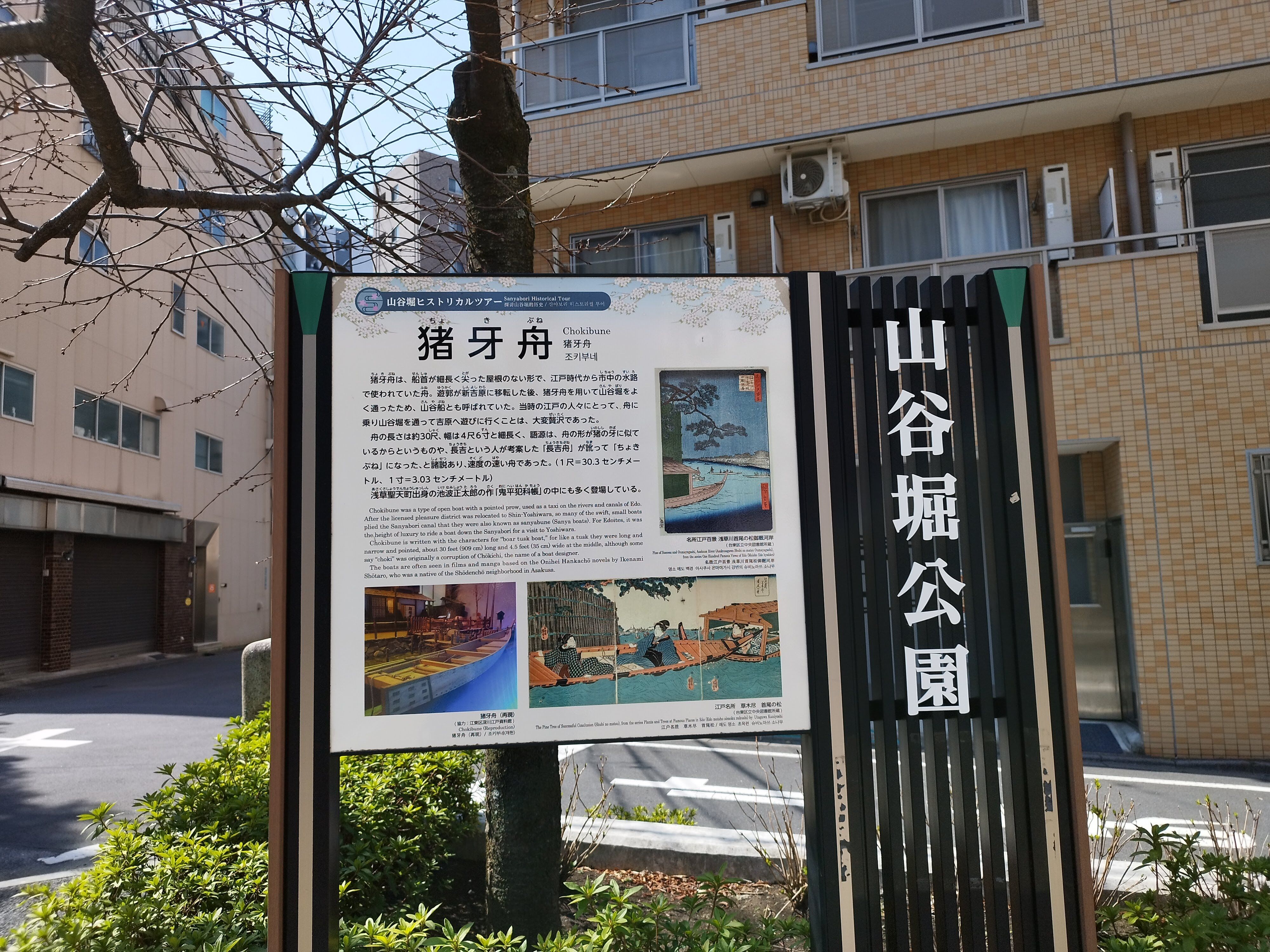 江戸時代には、山谷船とも呼ばれた「猪牙舟(ちょきぶね)」でこの水路を通って遊郭の吉原へ遊びに行くことが、ぜいたくな遊びとして流行したと伝えられています。