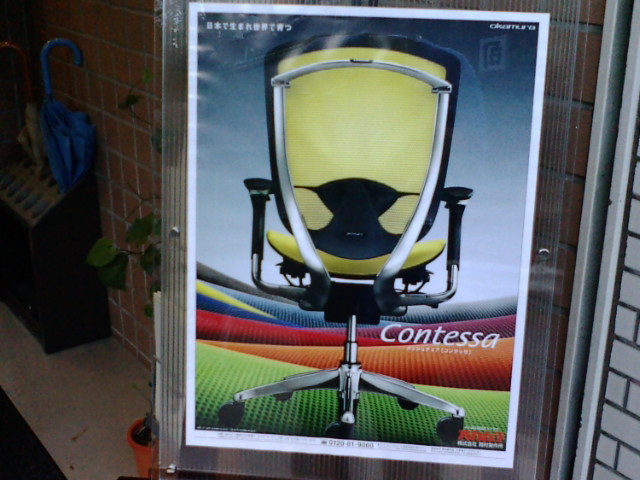 いつも外に飾っている看板をオフィス事業部取り扱い商品のコンテッサに変えてみました。コンテッサは岡村製作所の代表的な椅子で価格は14万円から17万円位するんですよ。