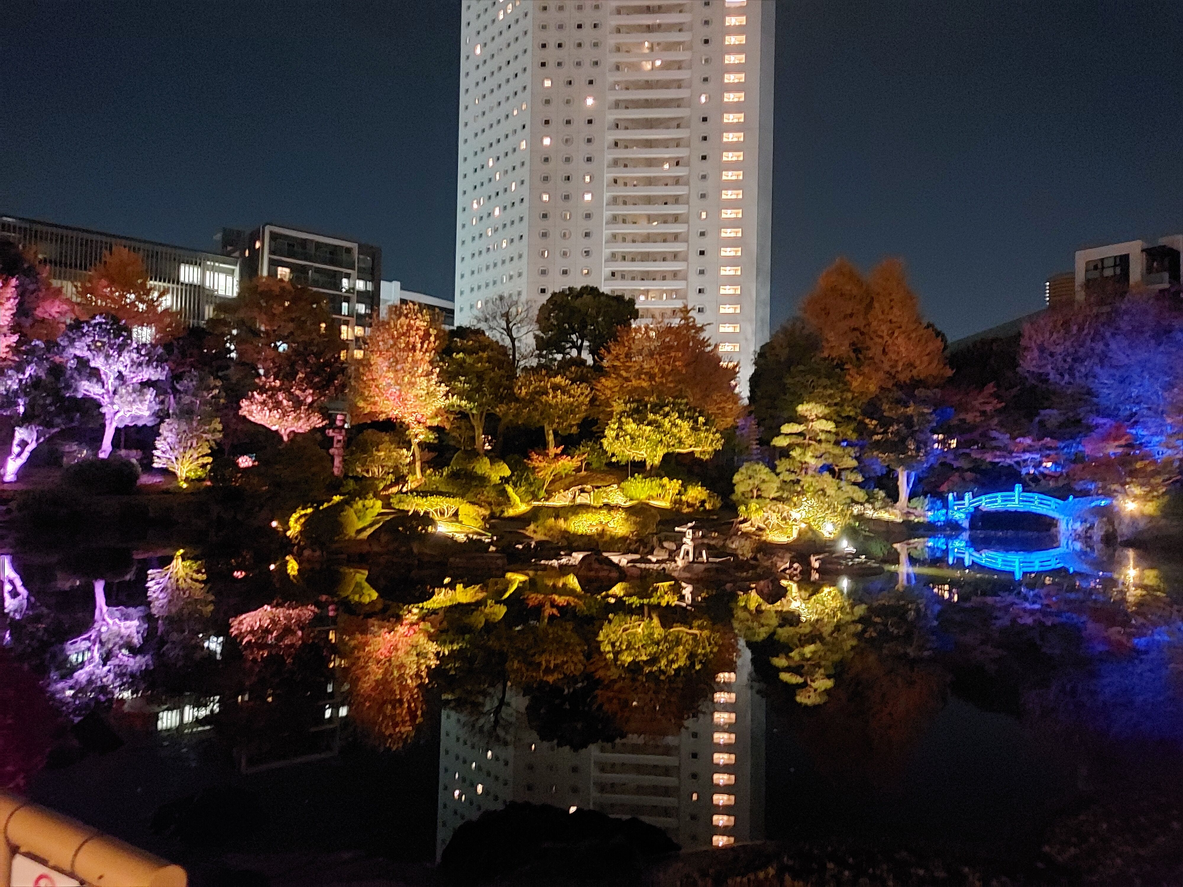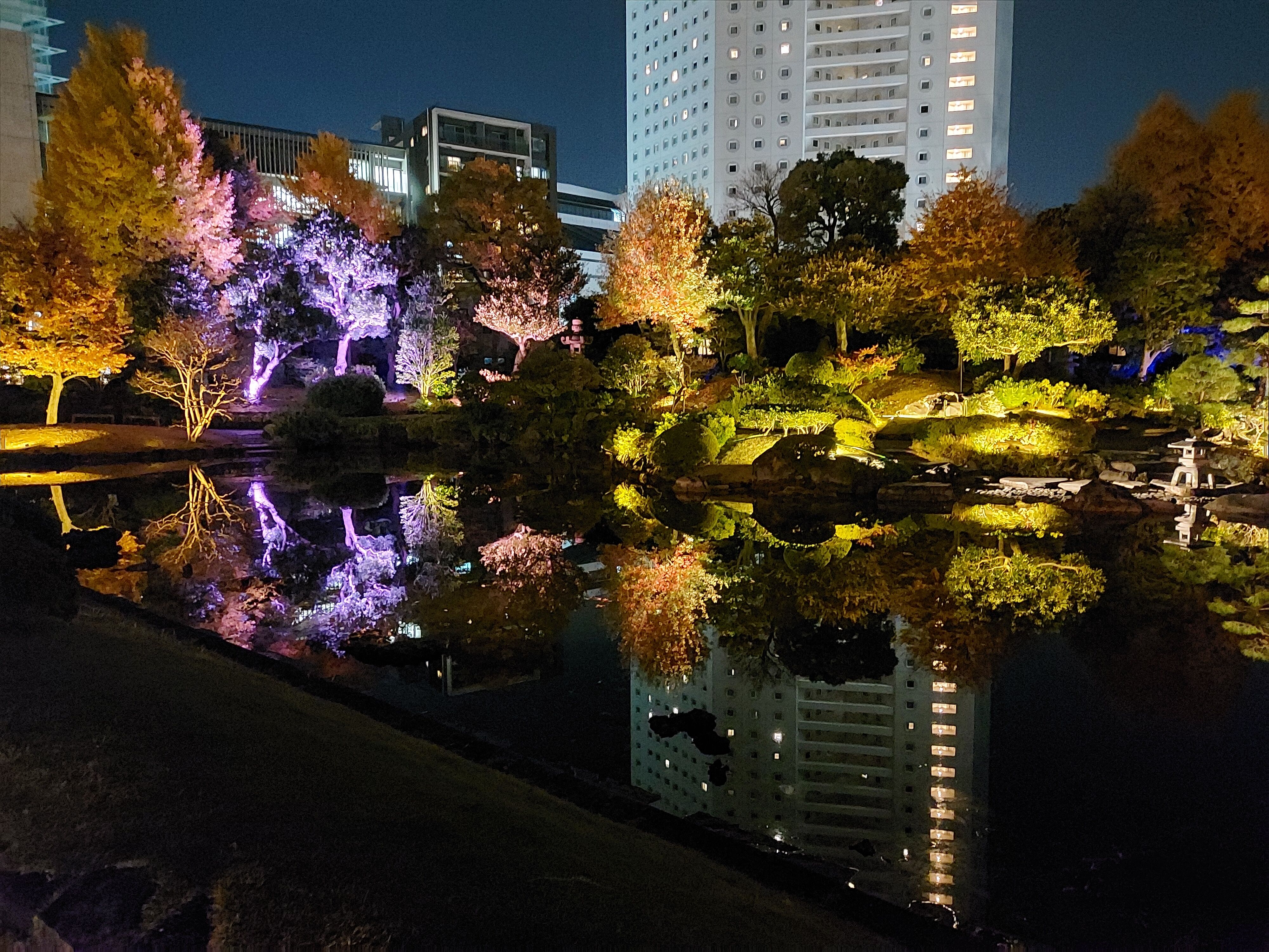 旧安田庭園はホテルなど高層ビルに囲まれていますが、その明かりもまたいい演出になっていますね