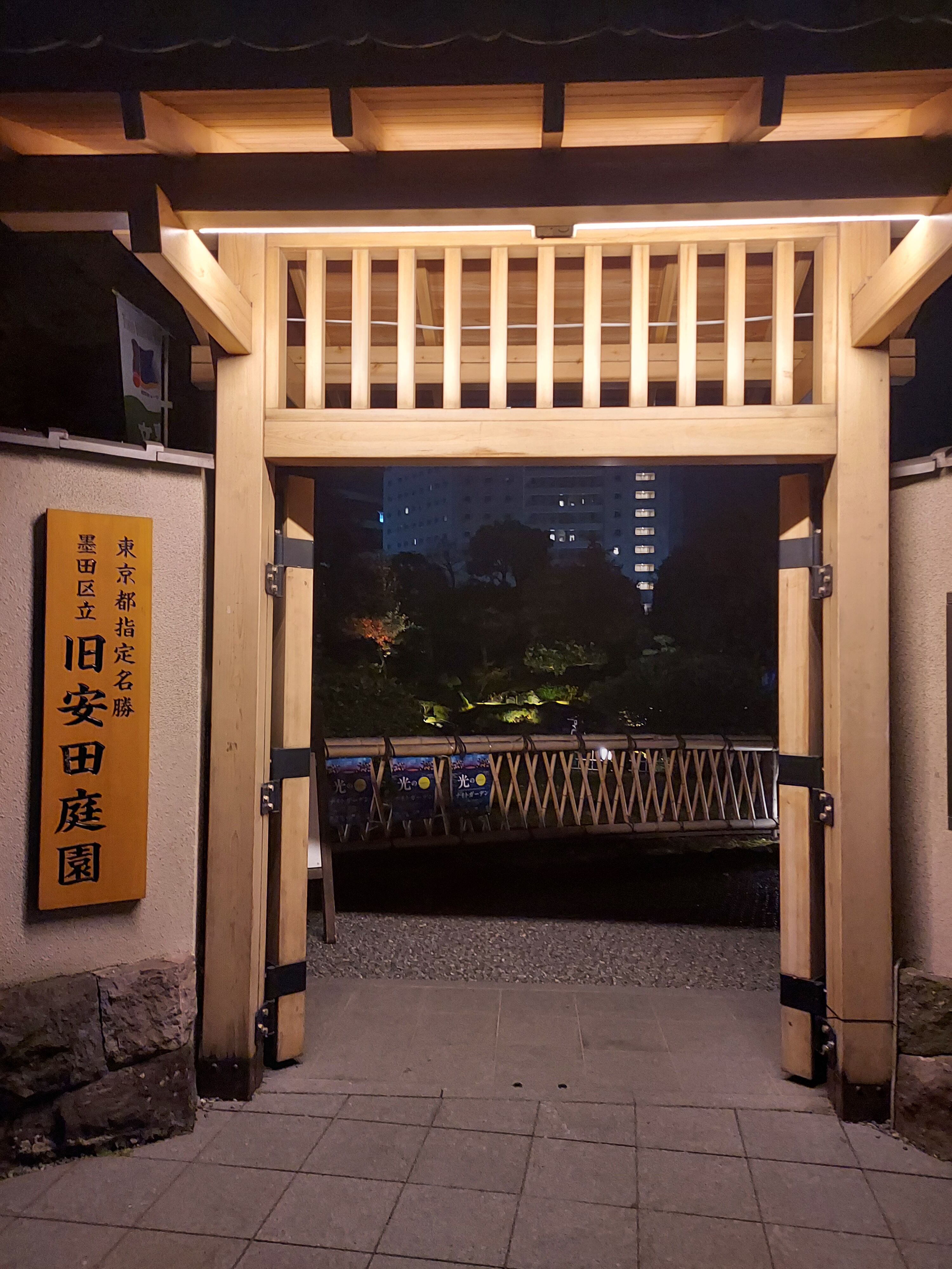旧安田庭園は門が3カ所ありますが、両国駅に一番近い門はライトアップの時間は閉鎖されています。刀剣博物館脇の門から入るのがおすすめですよ!!