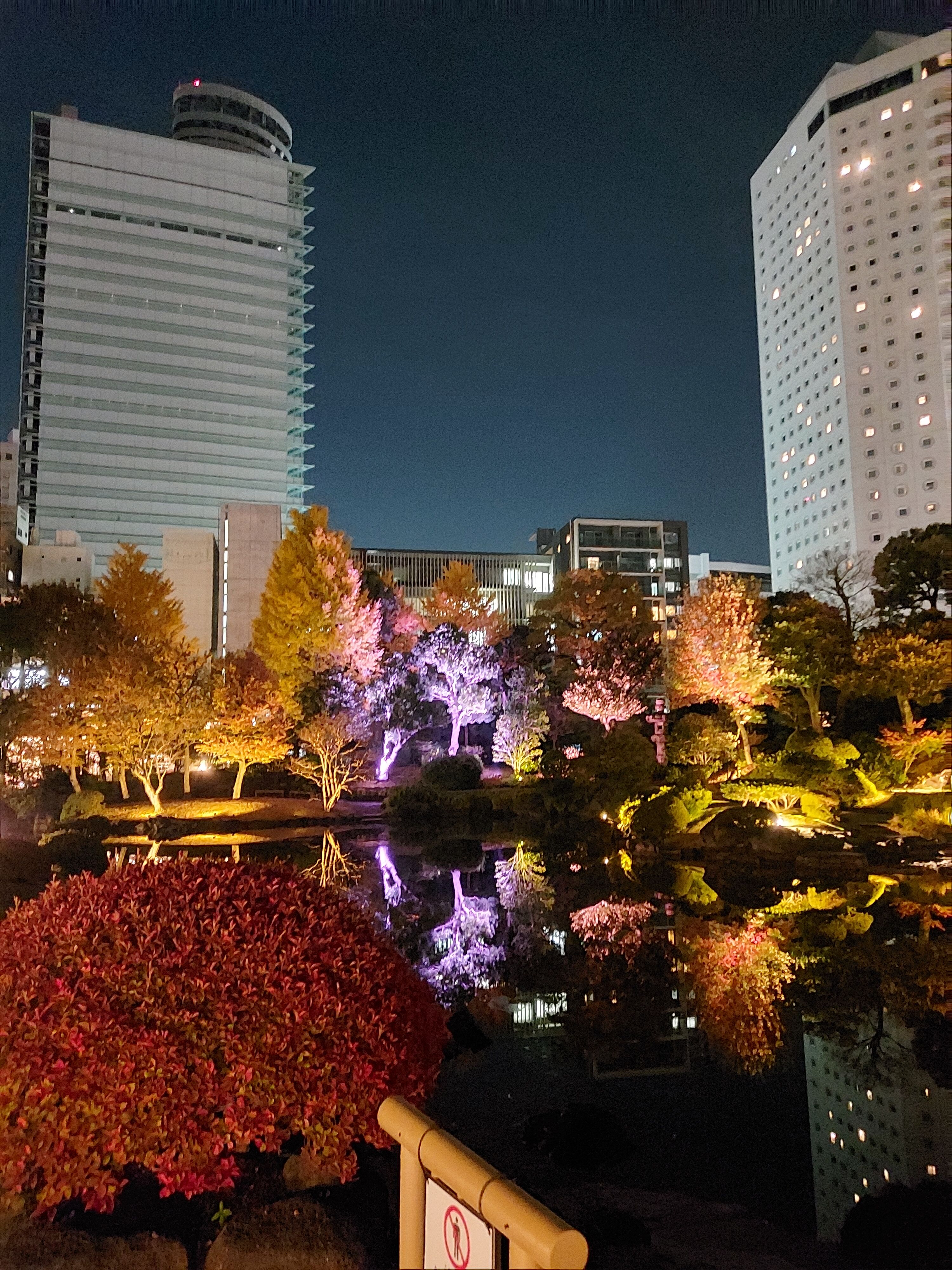 派手さはないですが、紅葉の庭園とライトと都会の明かりと、とても風情があり素敵な空間でした
